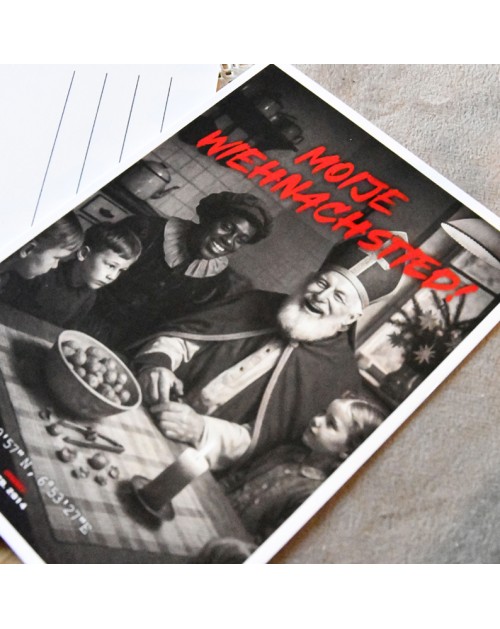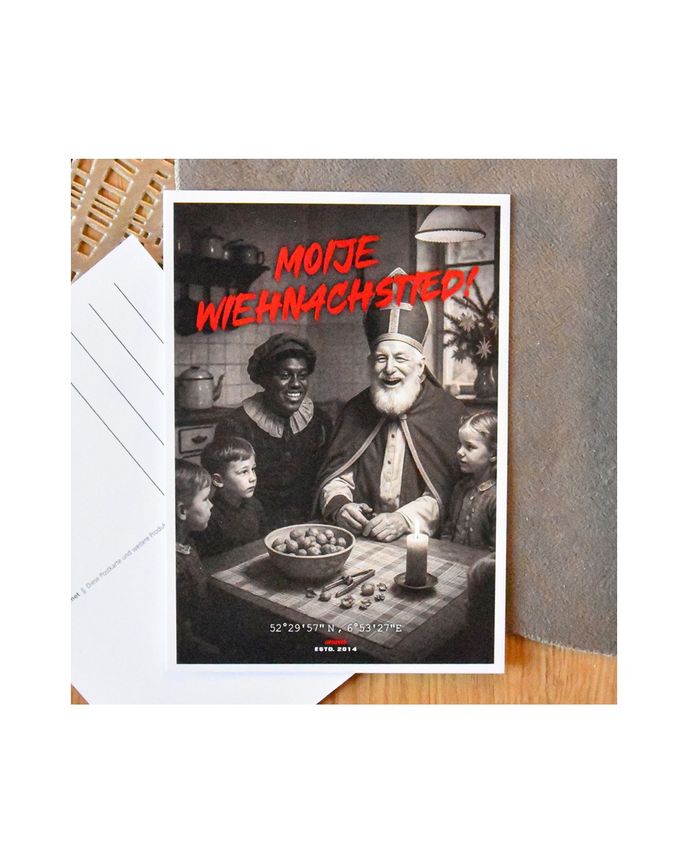 Diese nostalgische Weihnachtskarte mit der plattdeutschen Aufschrift „Moije Wiehnachtstied!“ (Bedeutung: Eine schöne Weihnachtszeit) zeigt den Nikolaus, der mit Kindern und seinem Begleiter, dem „schwatten Piet“, fröhlich in einer Küche sitzt. Die liebevoll gestaltete Szene erinnert an traditionelle Weihnachtsfeste und vermittelt Wärme und Gemütlichkeit.